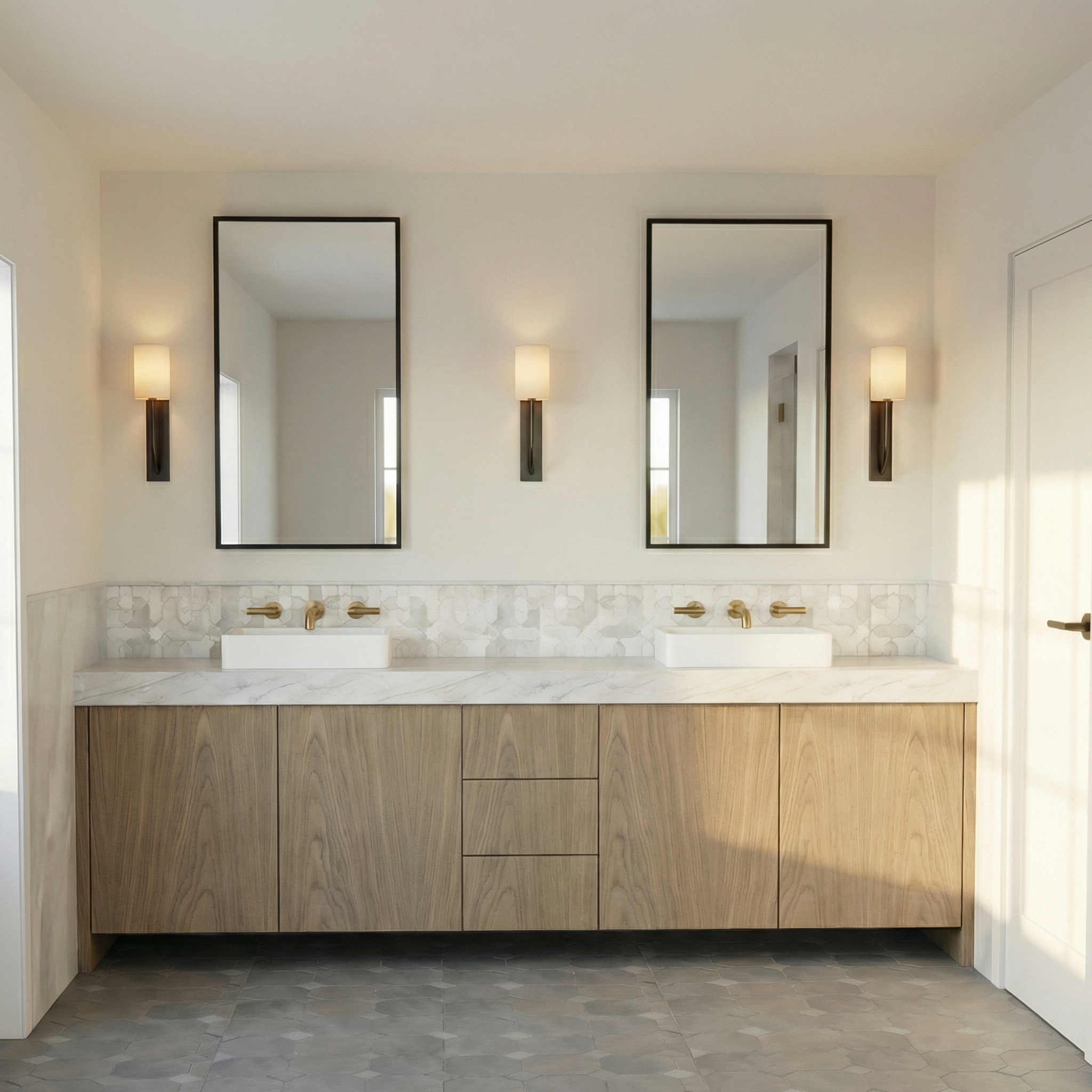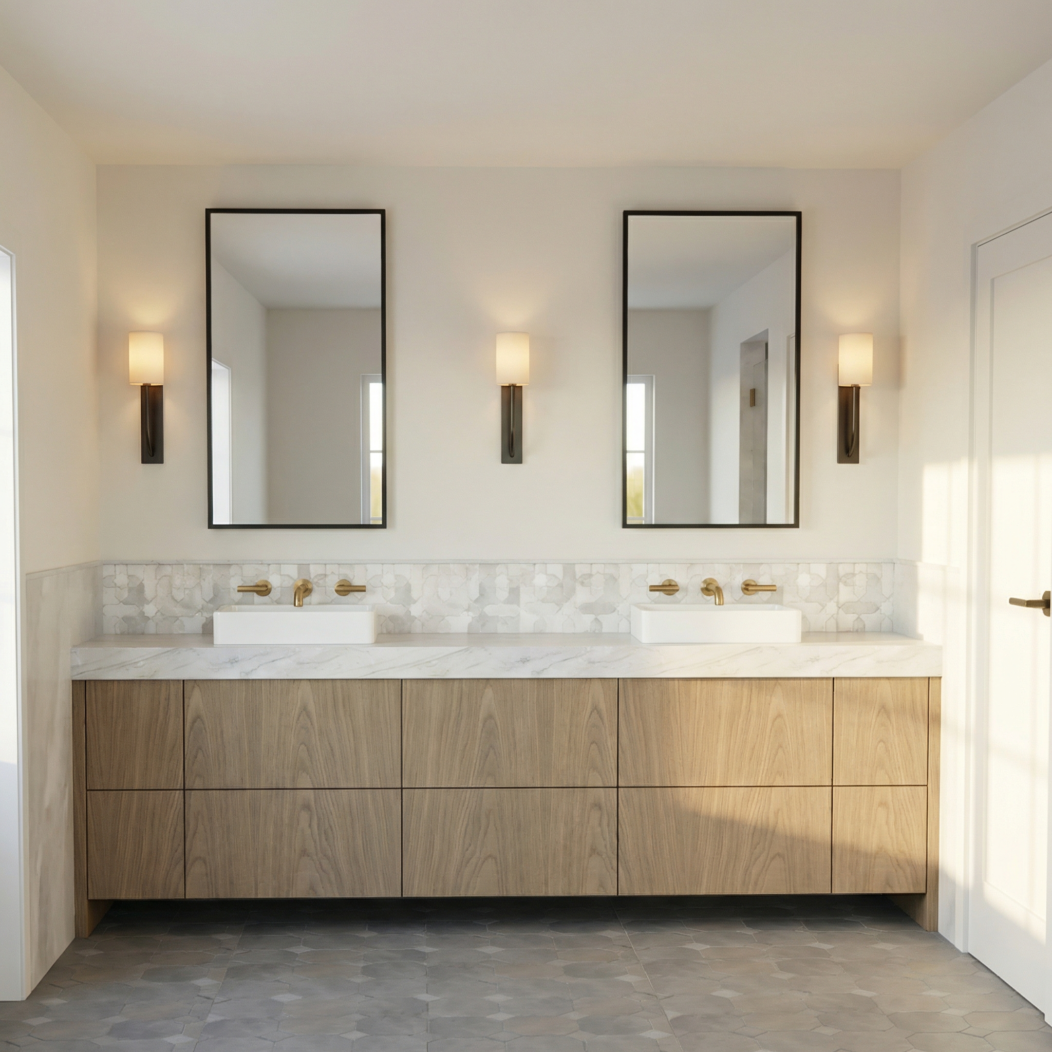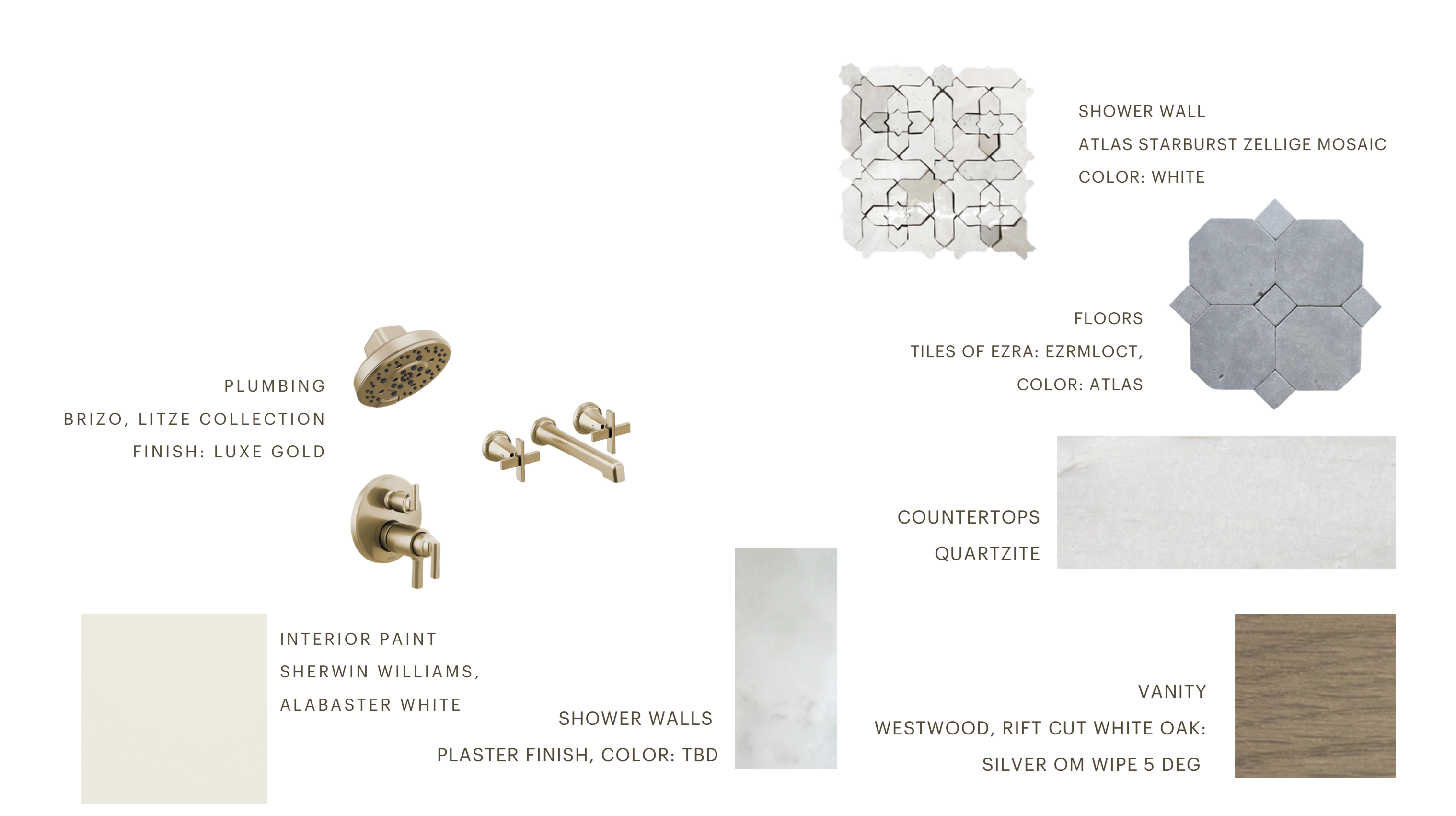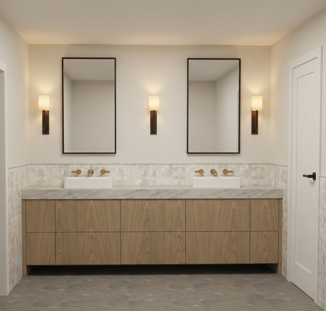 White door. Only fixture lighting. Vanity backsplash wraps onto left and right walls. Make sure to use the specific gold faucet from attached reference image (brizo Litz collection)