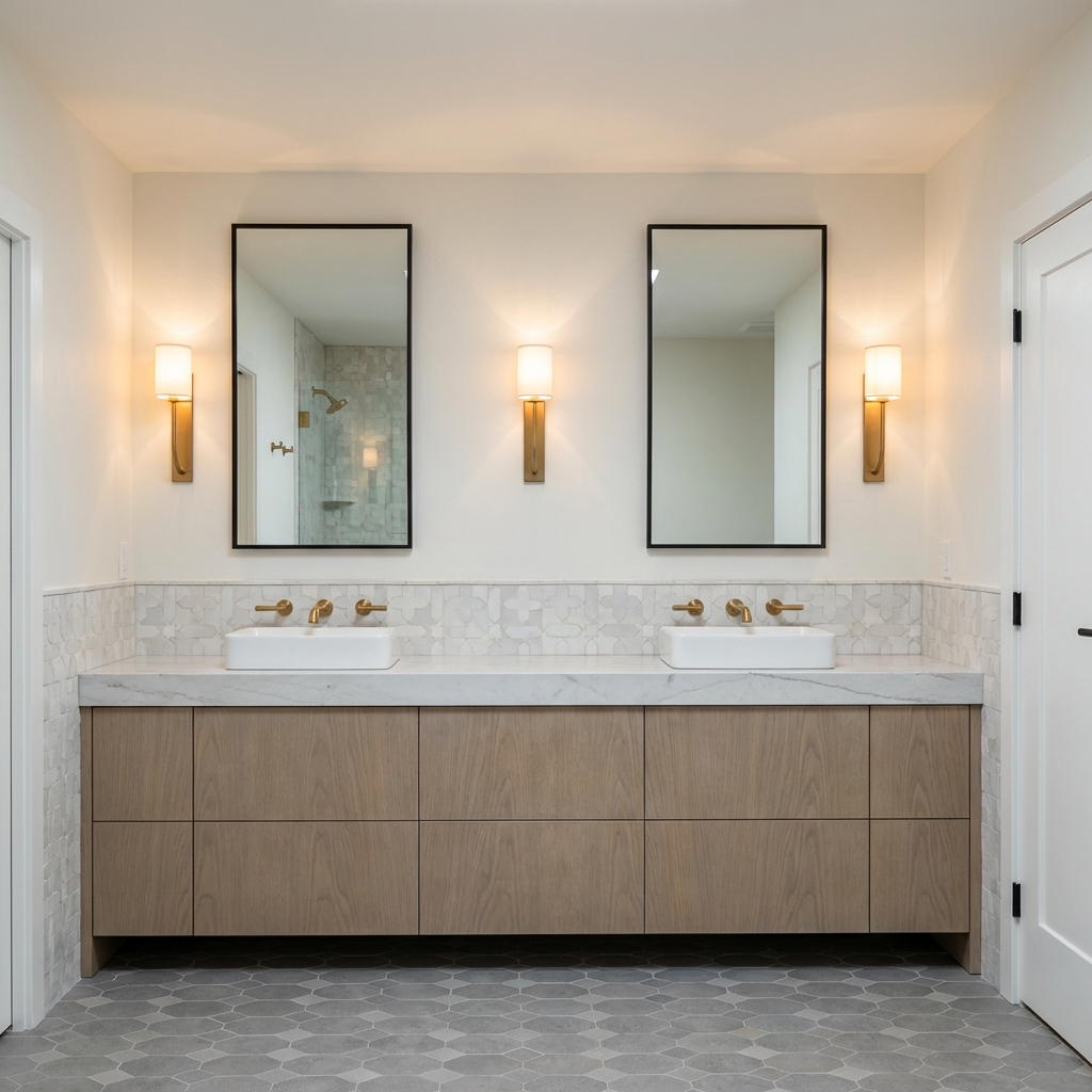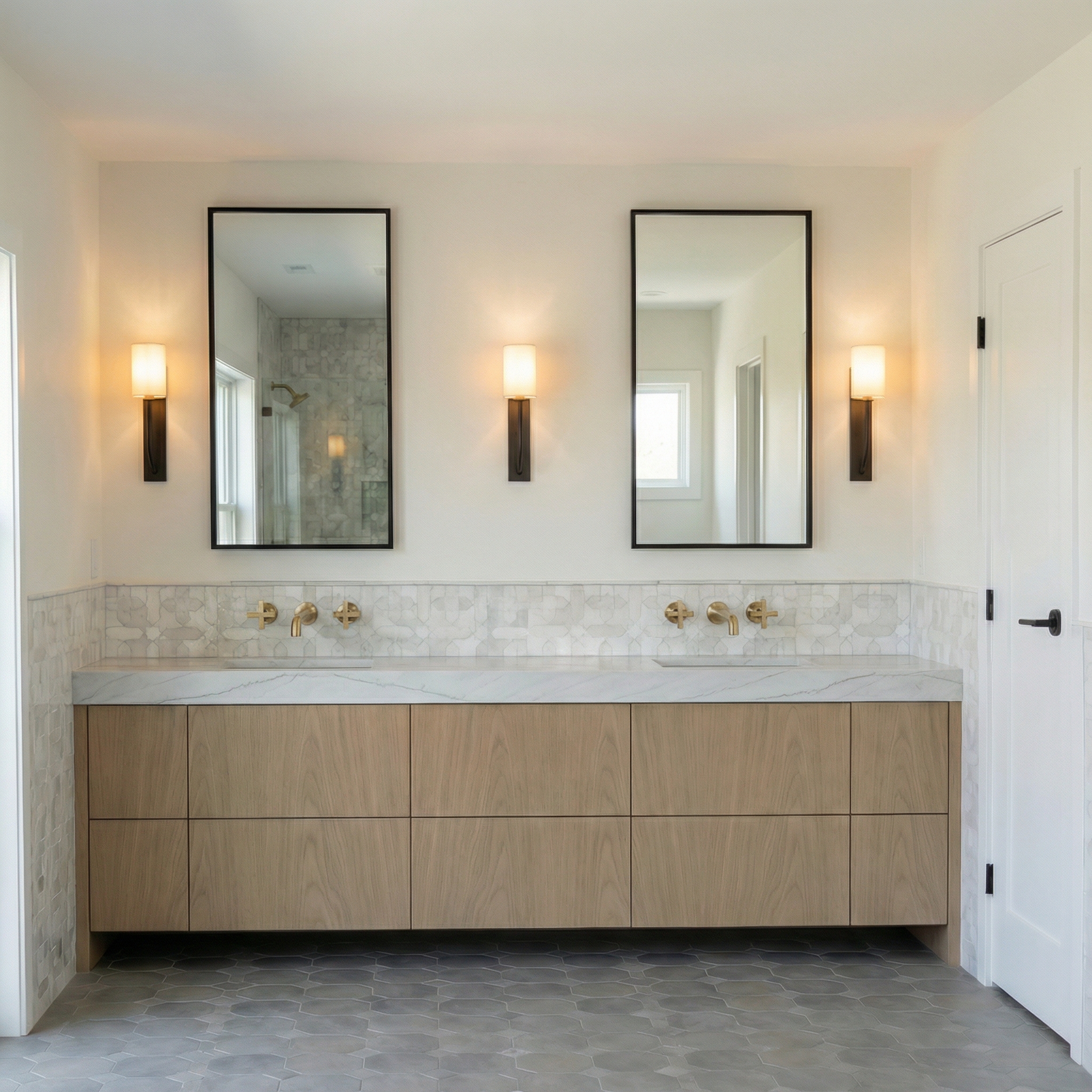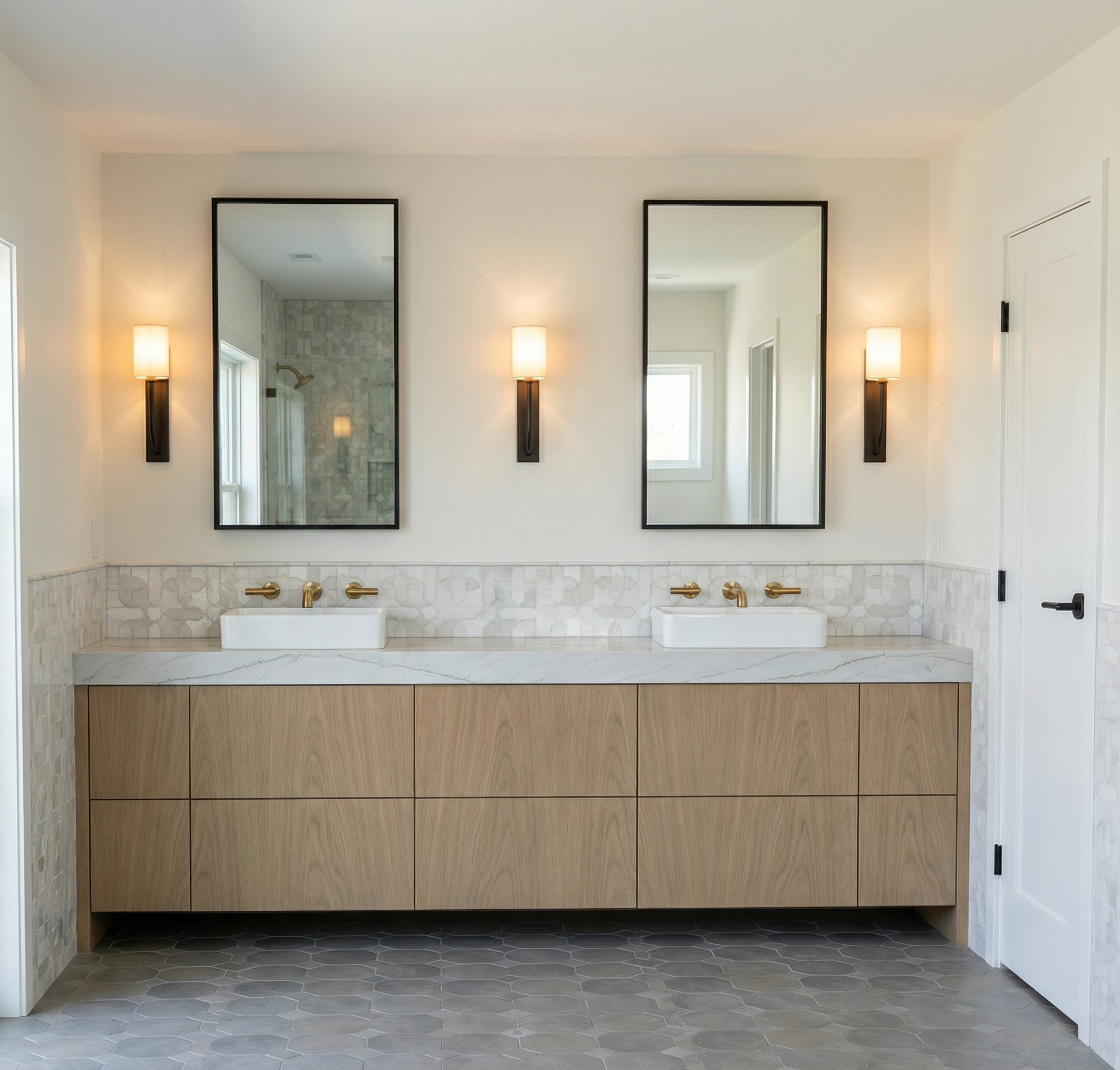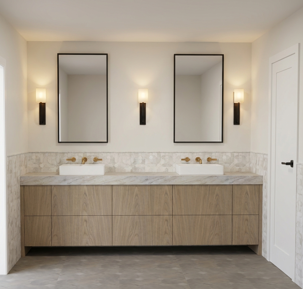 White door. Only fixture lighting. Vanity backsplash wraps onto left and right walls. Make sure to use the specific gold faucet from attached reference image (brizo Litz collection)