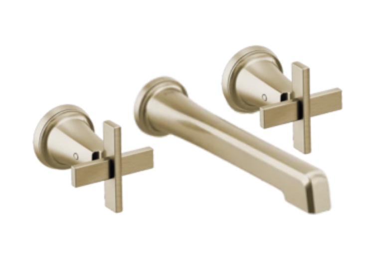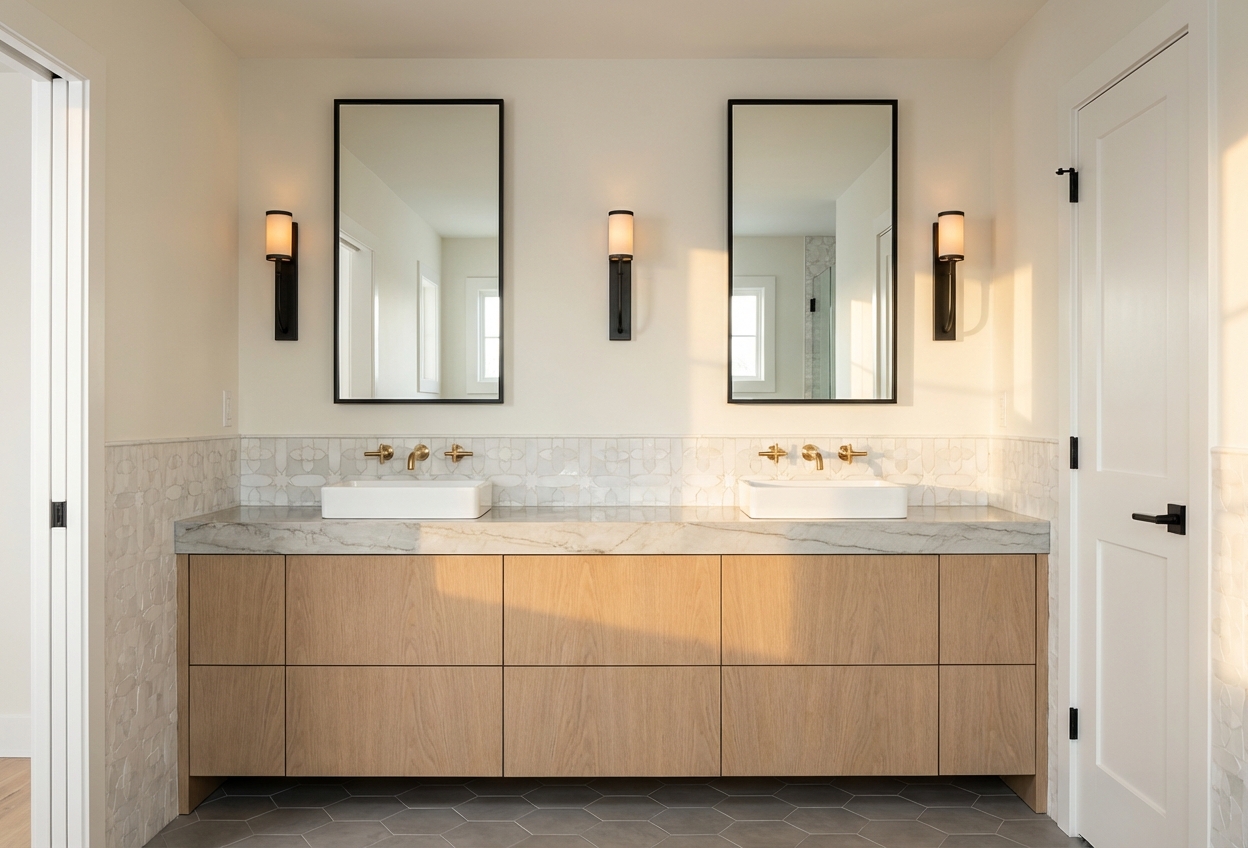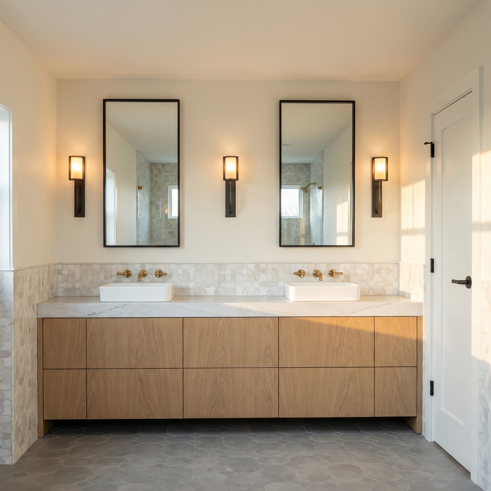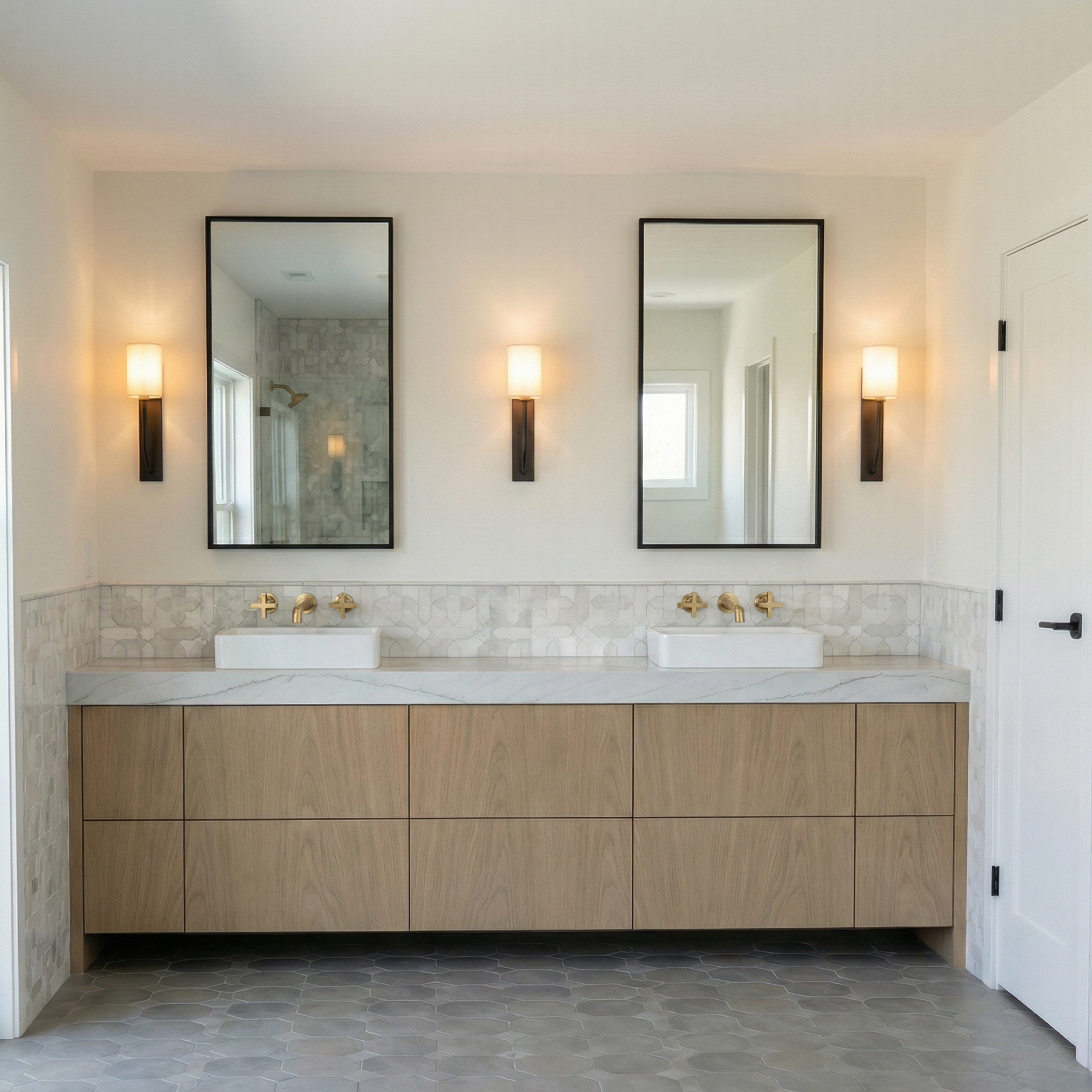 White door. Only fixture lighting. Vanity backsplash wraps onto left and right walls. Make sure to use the specific gold faucet from attached reference image (brizo Litz collection)