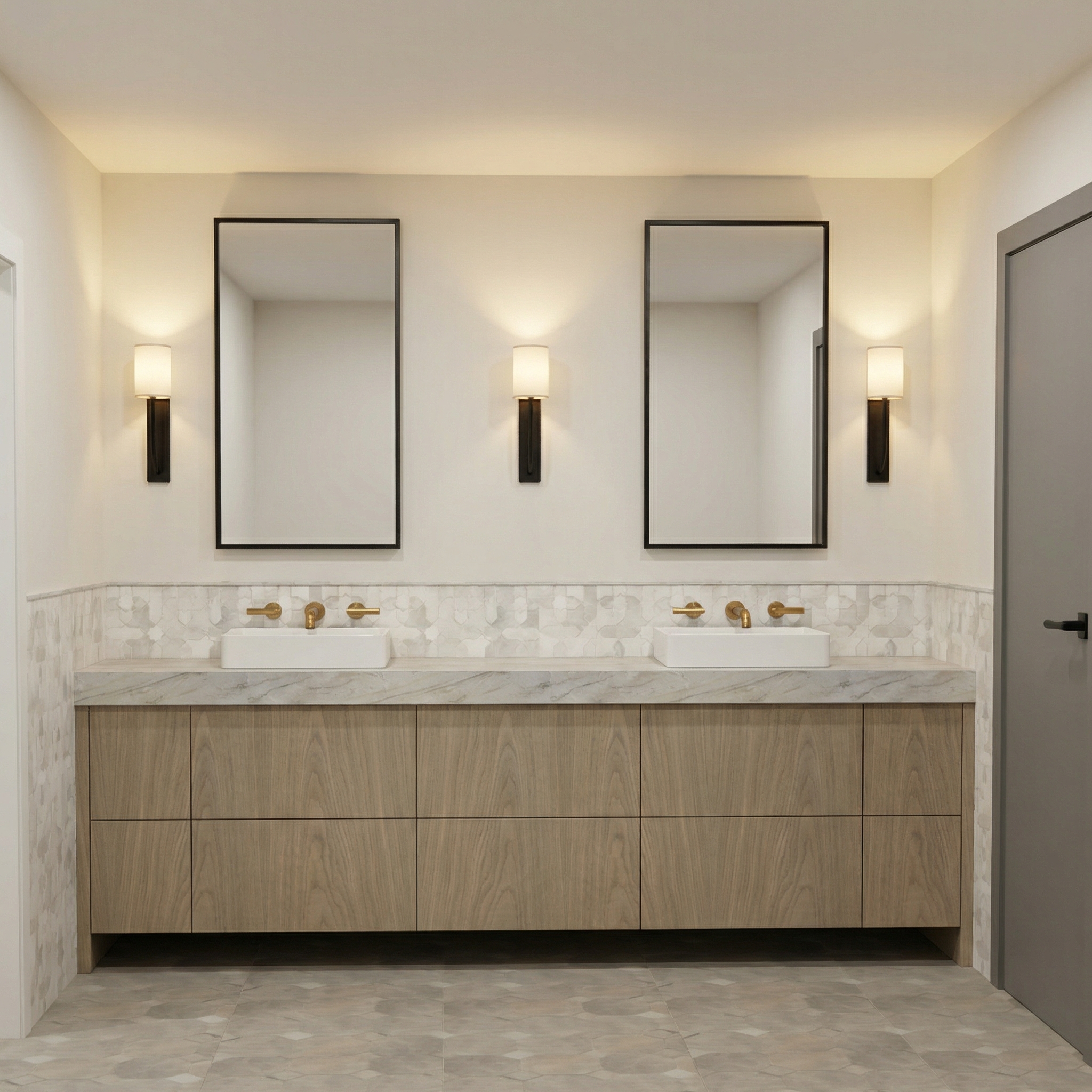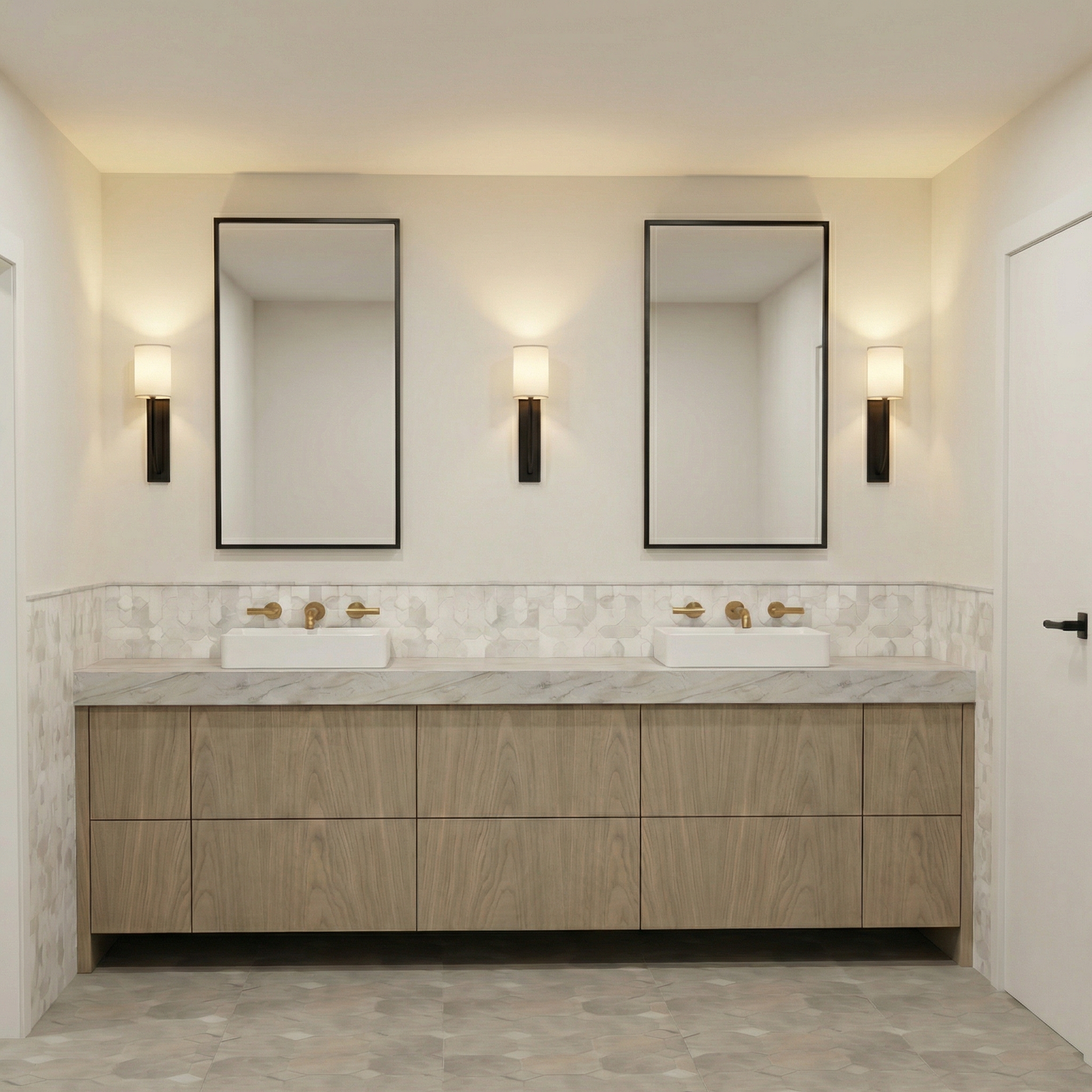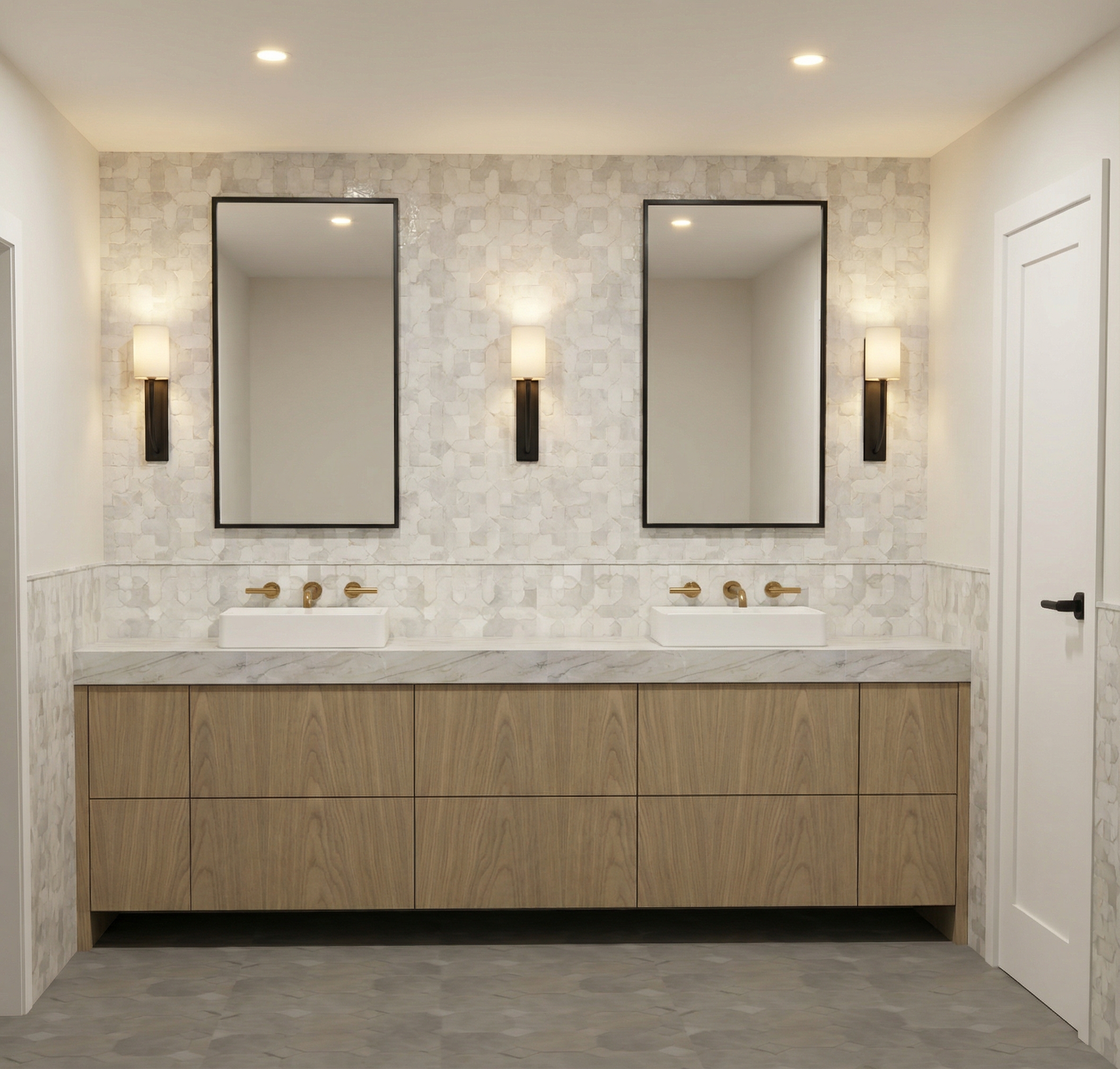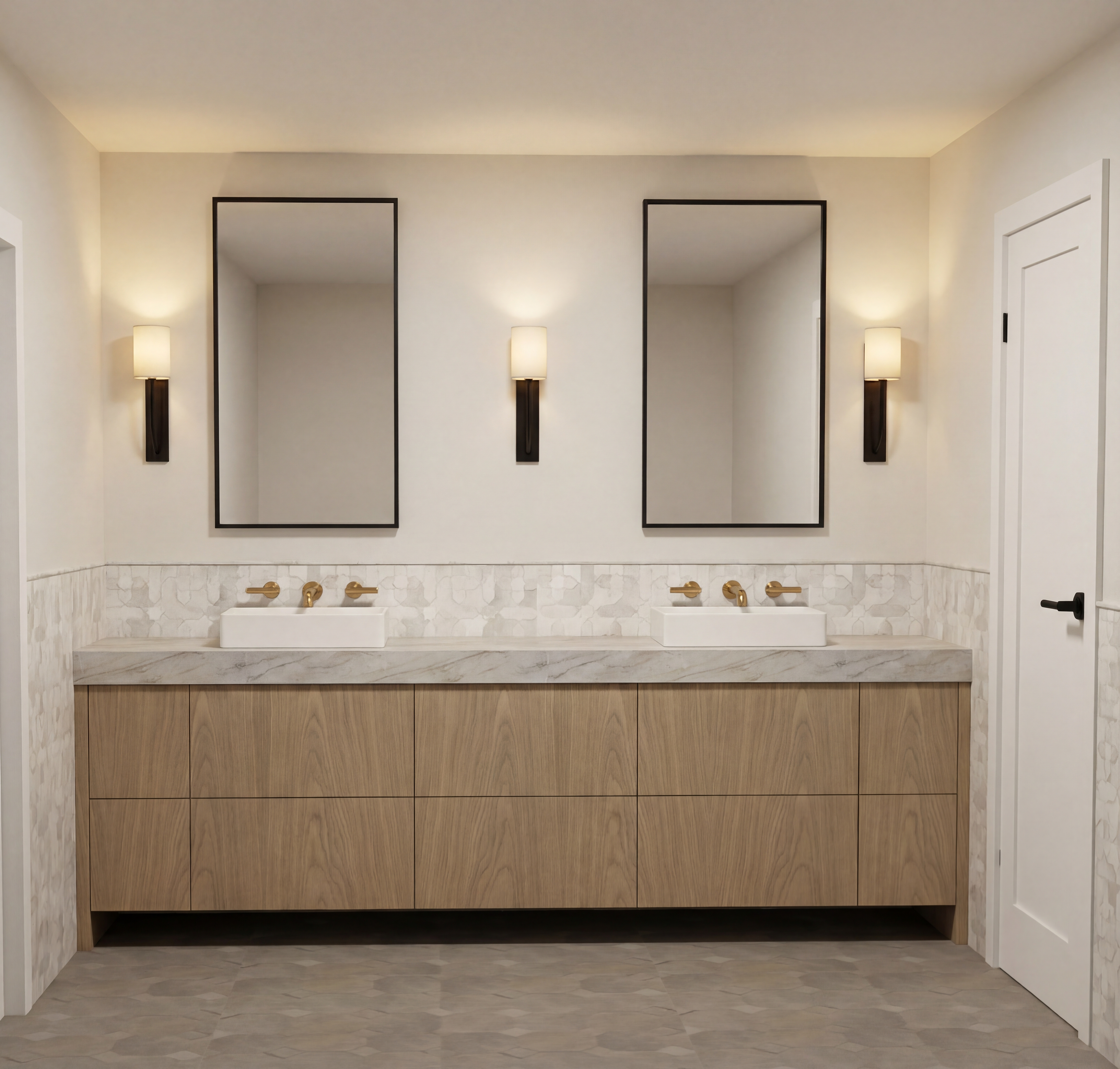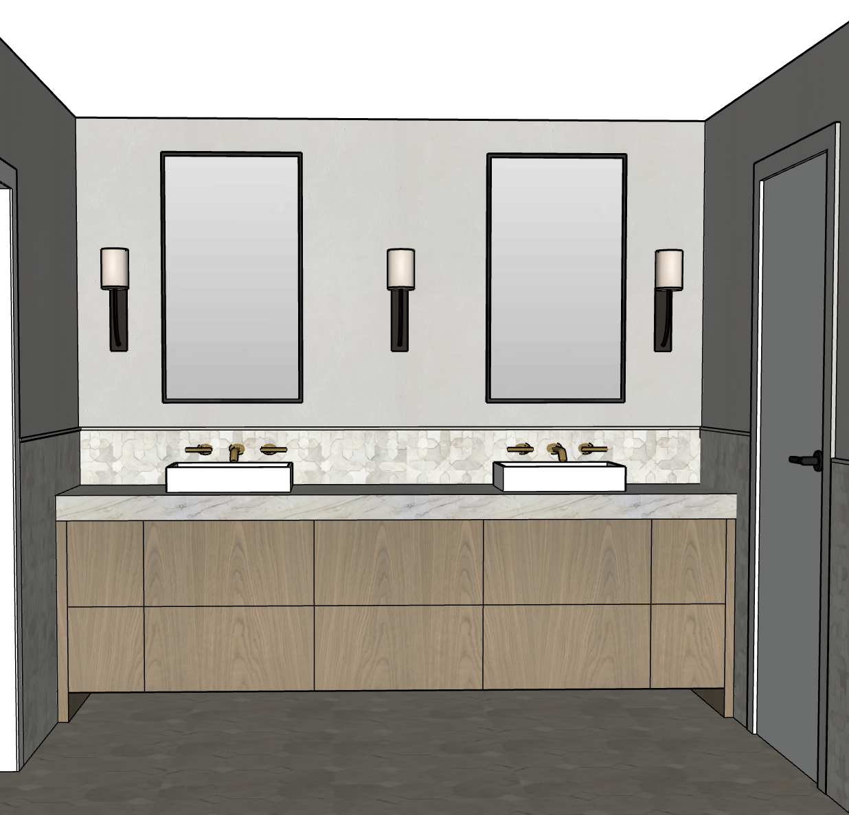 I've uploaded the sketchup render and the materials. The bathroom mirrors and light fixtures are black metal. The overhead light above the bathtub is also black.