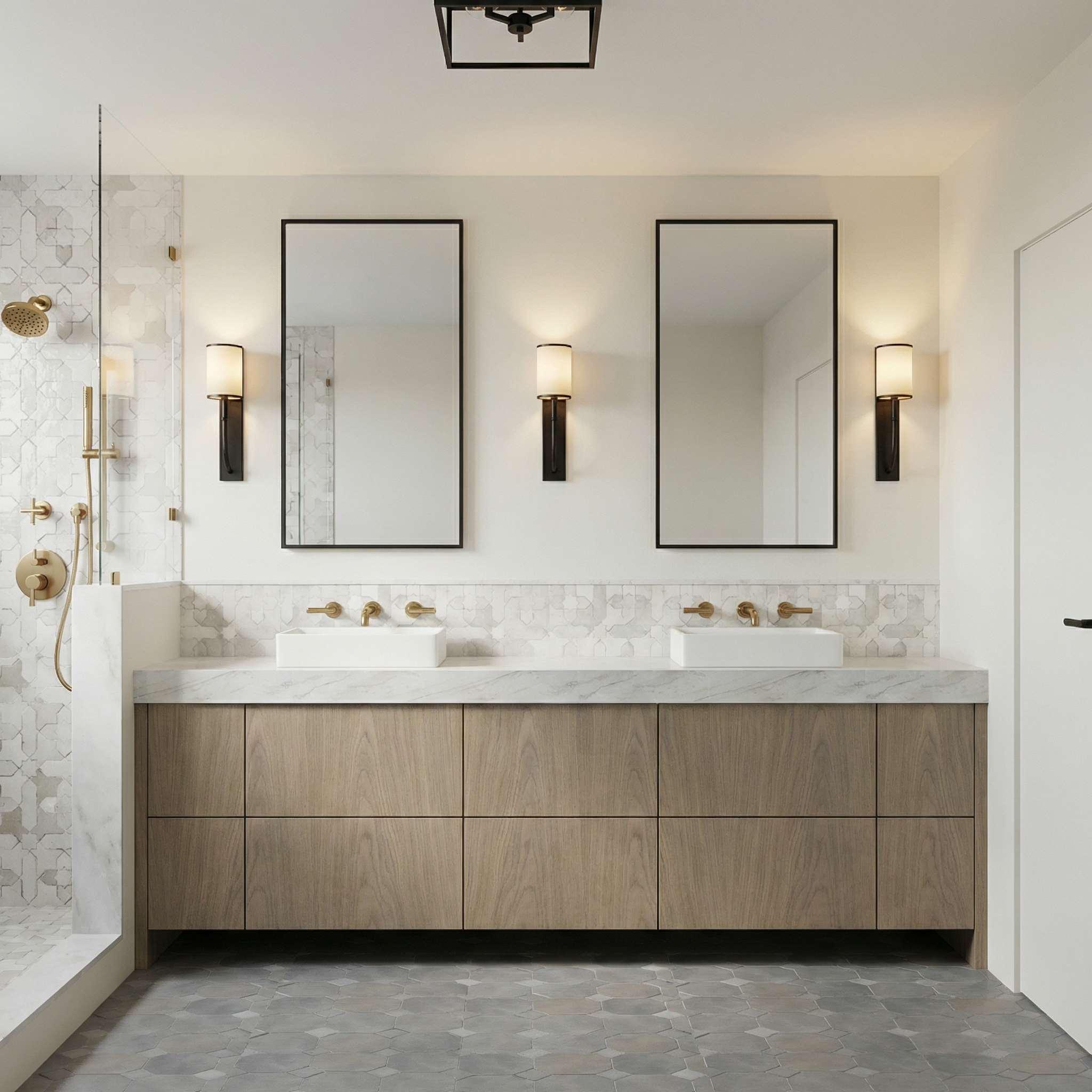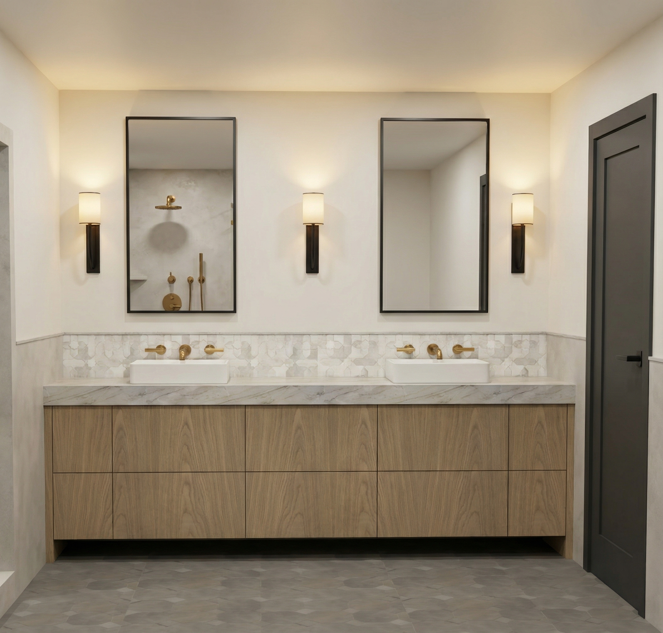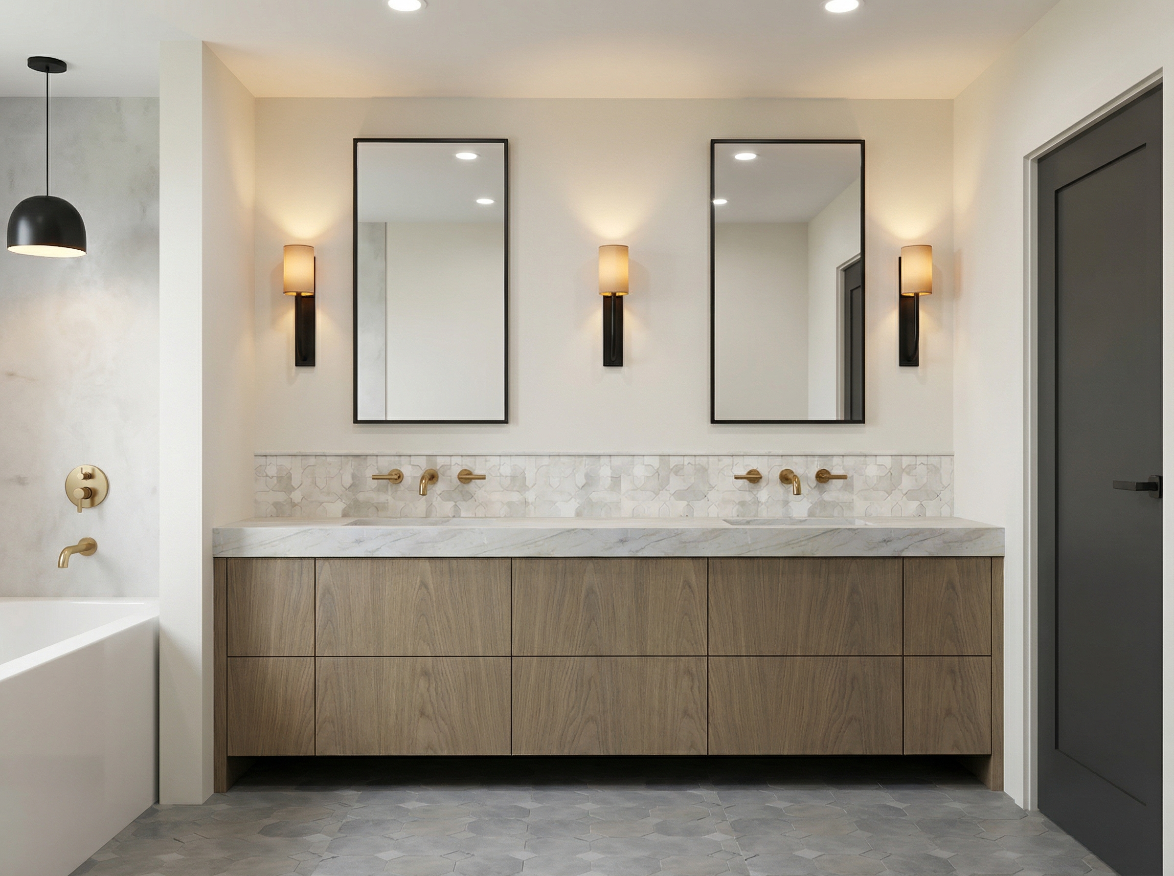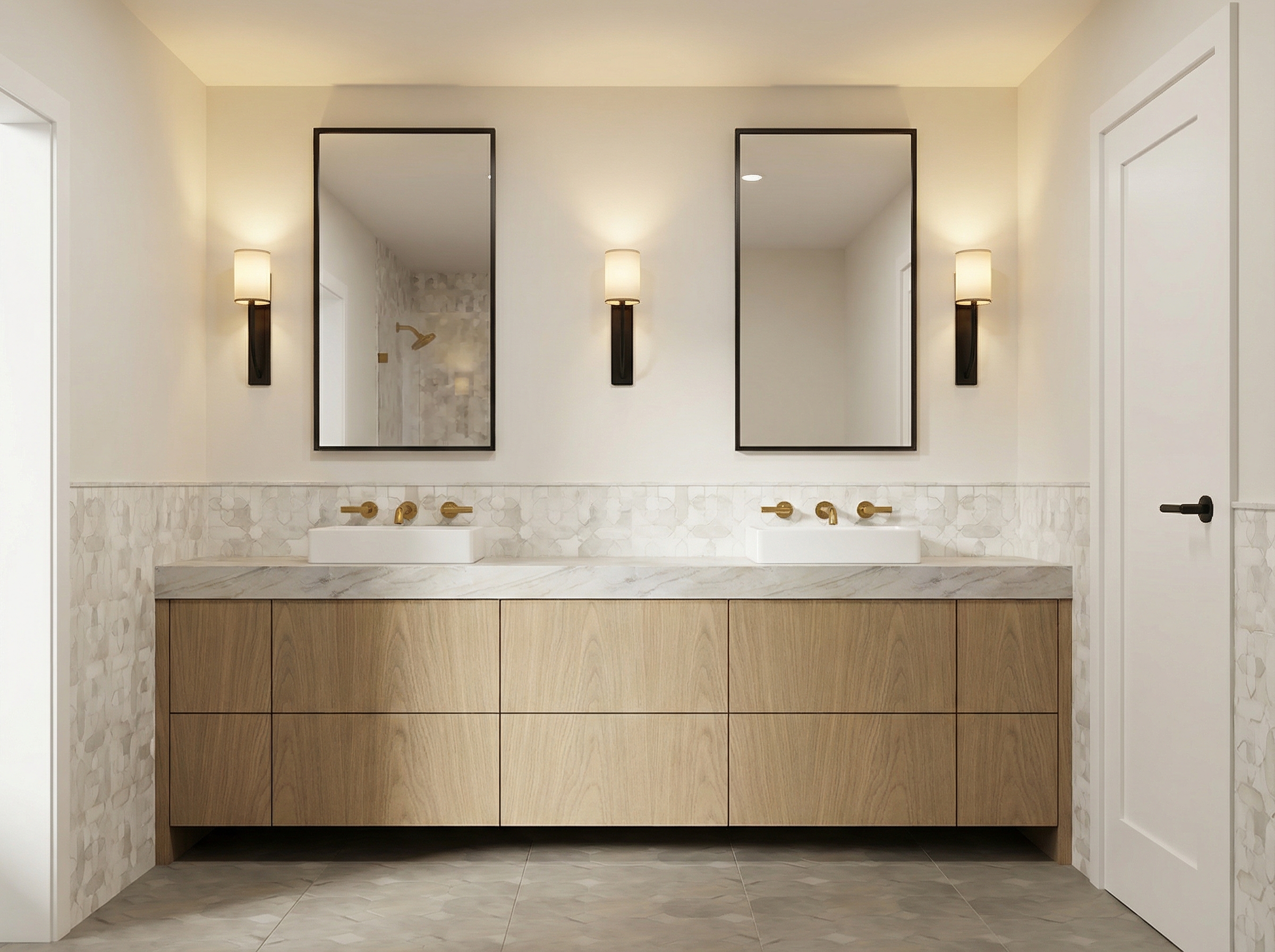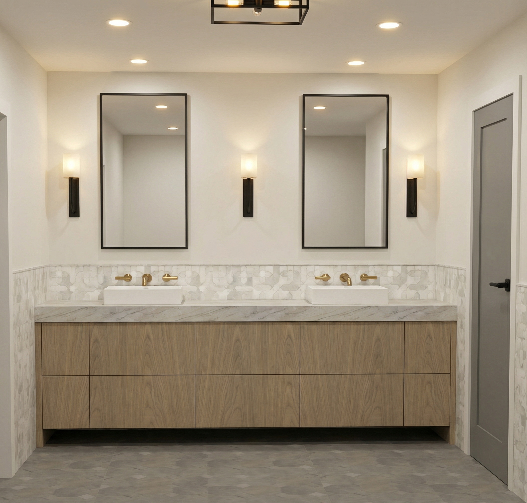 I've uploaded the sketchup render and the materials. The bathroom mirrors and light fixtures are black metal. The overhead light above the bathtub is also black.