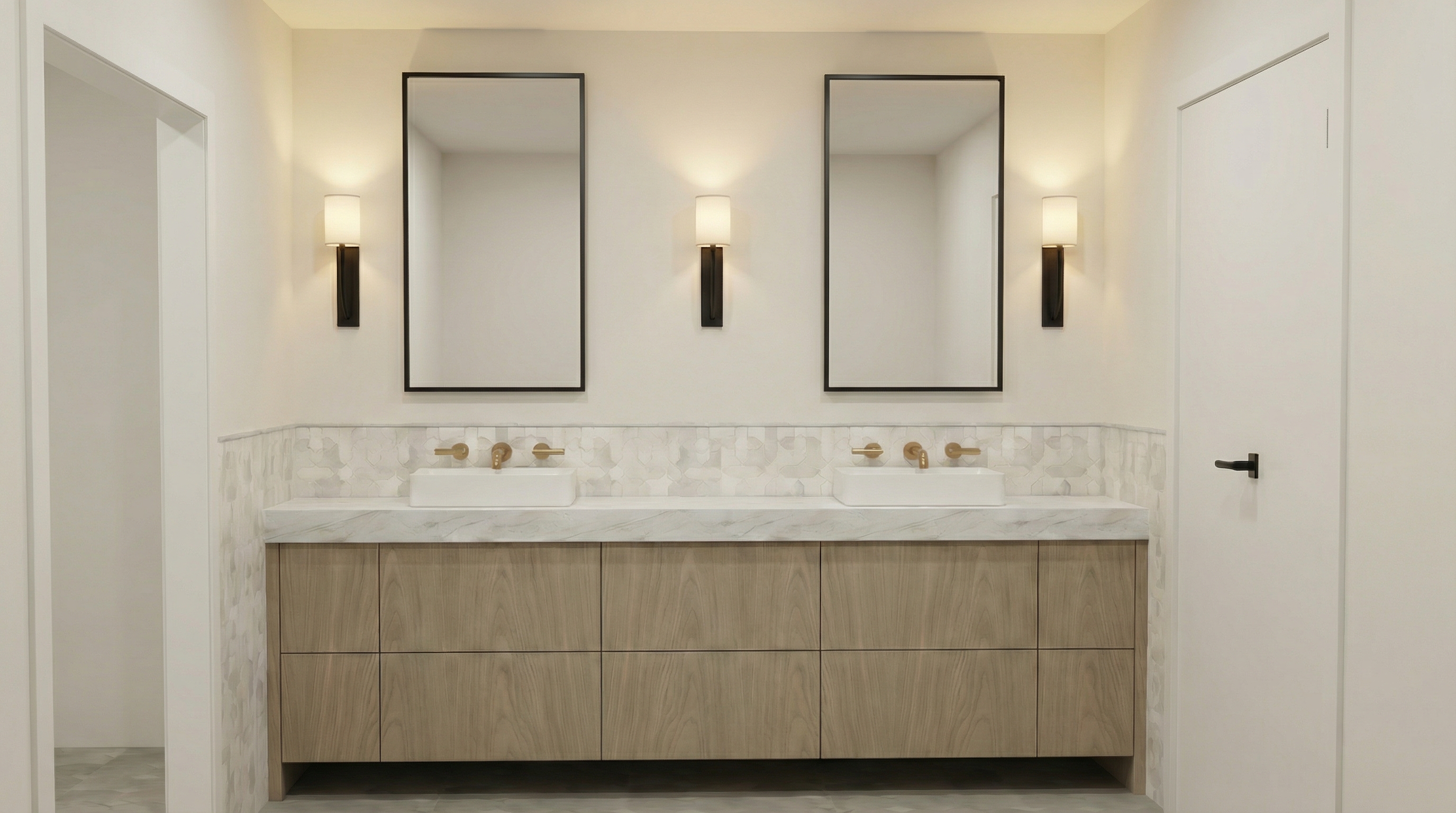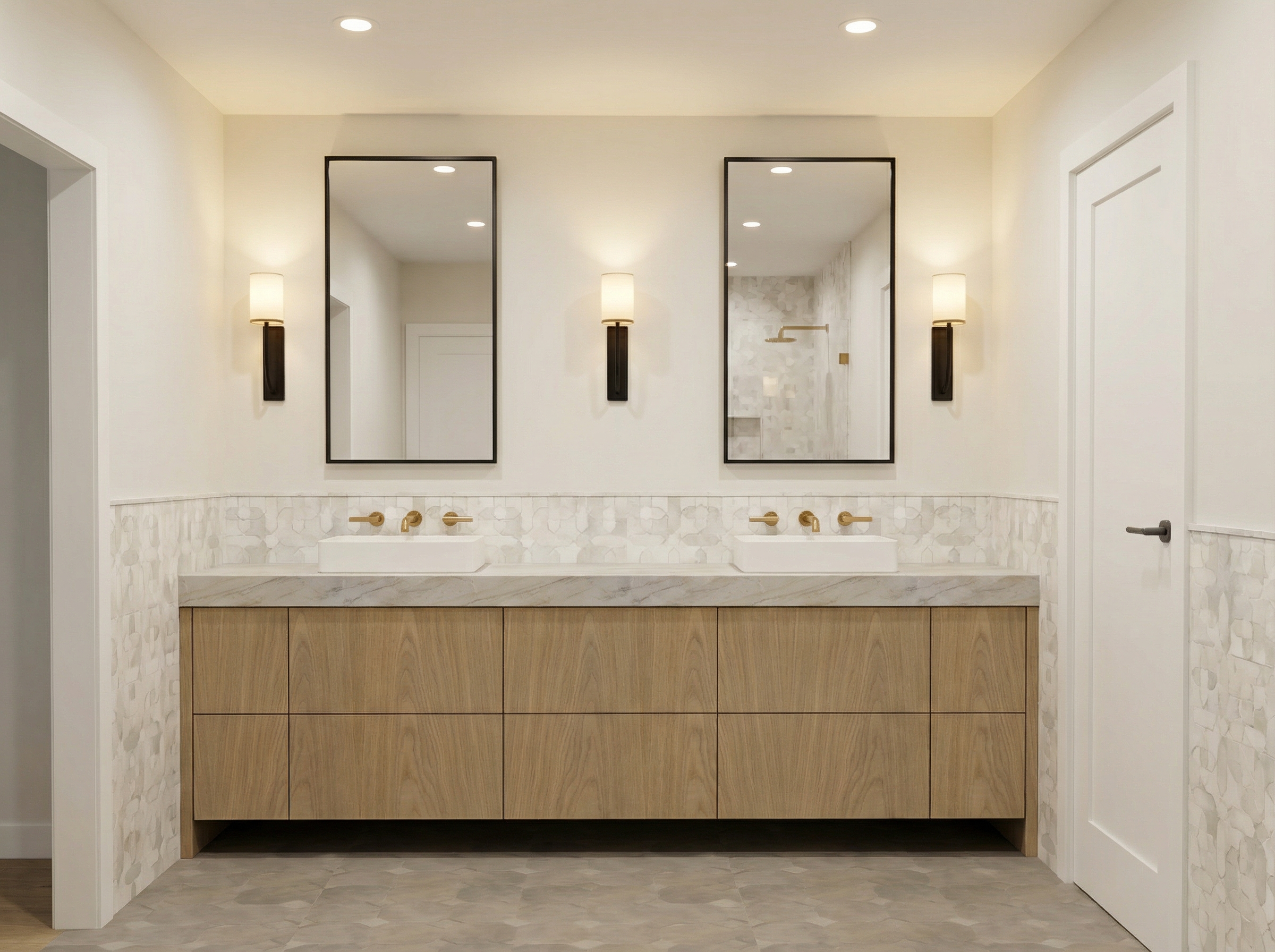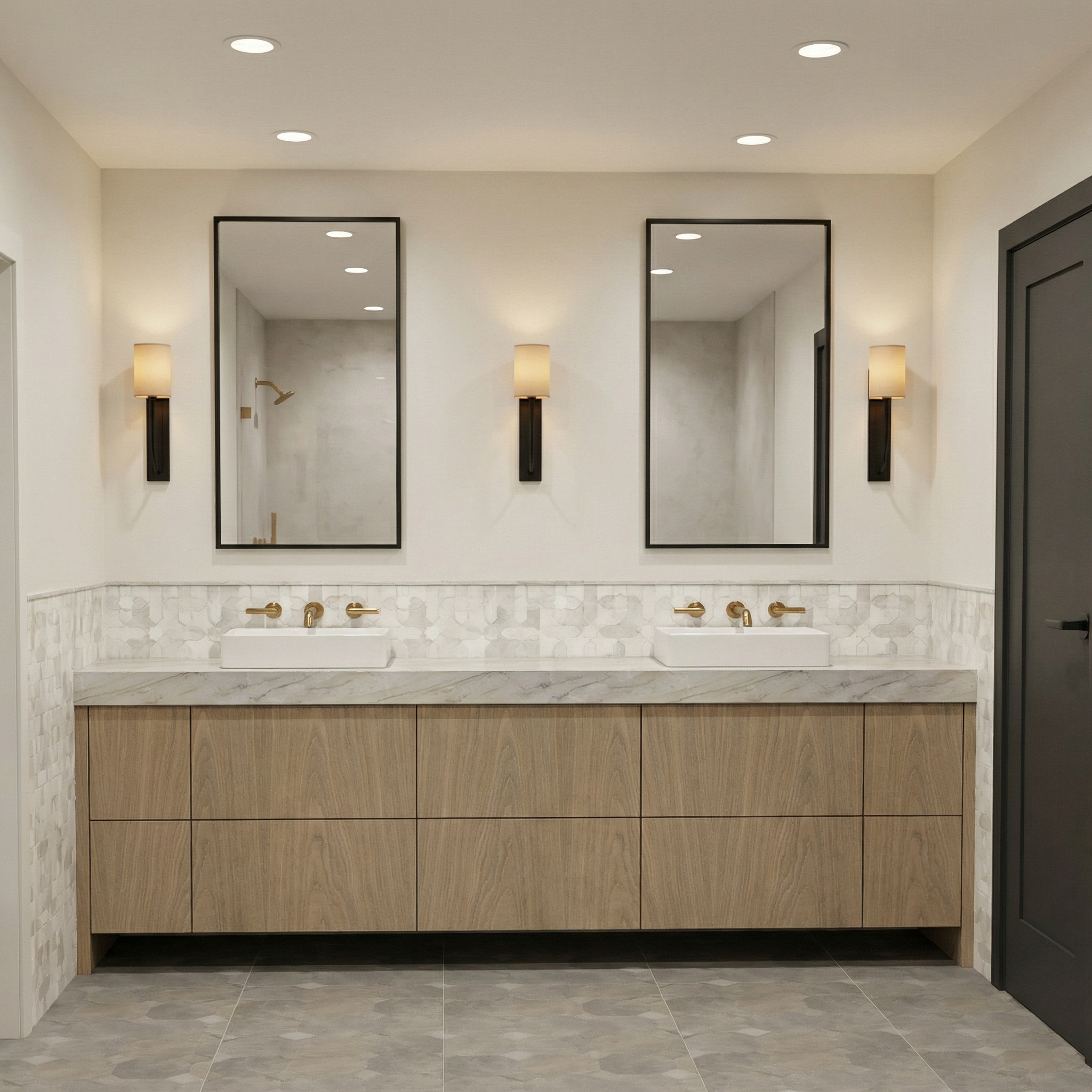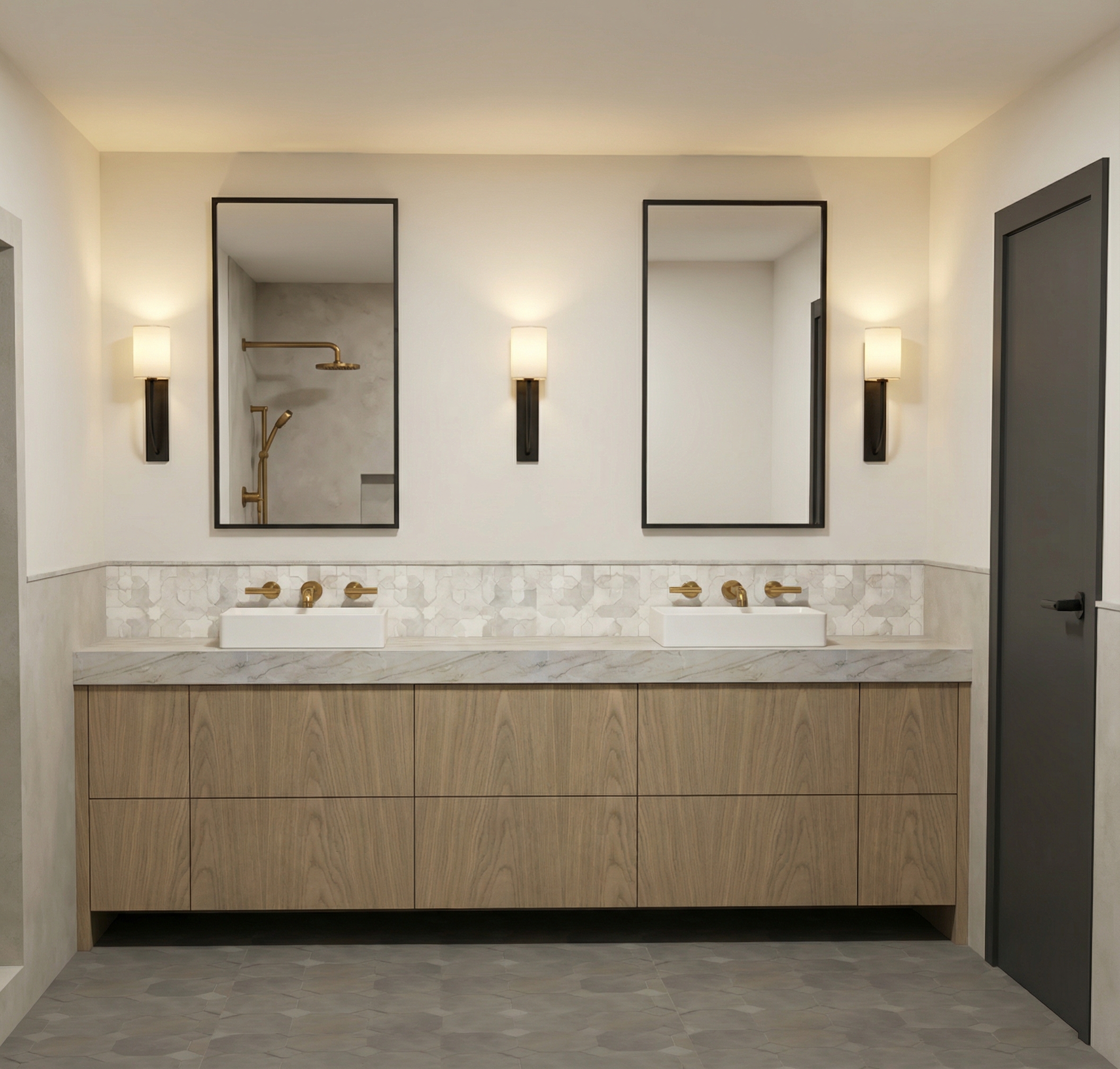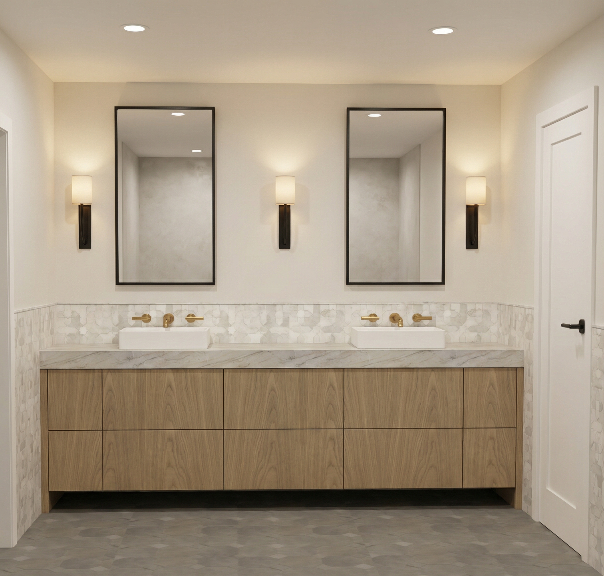 I've uploaded the sketchup render and the materials. The bathroom mirrors and light fixtures are black metal. The overhead light above the bathtub is also black.