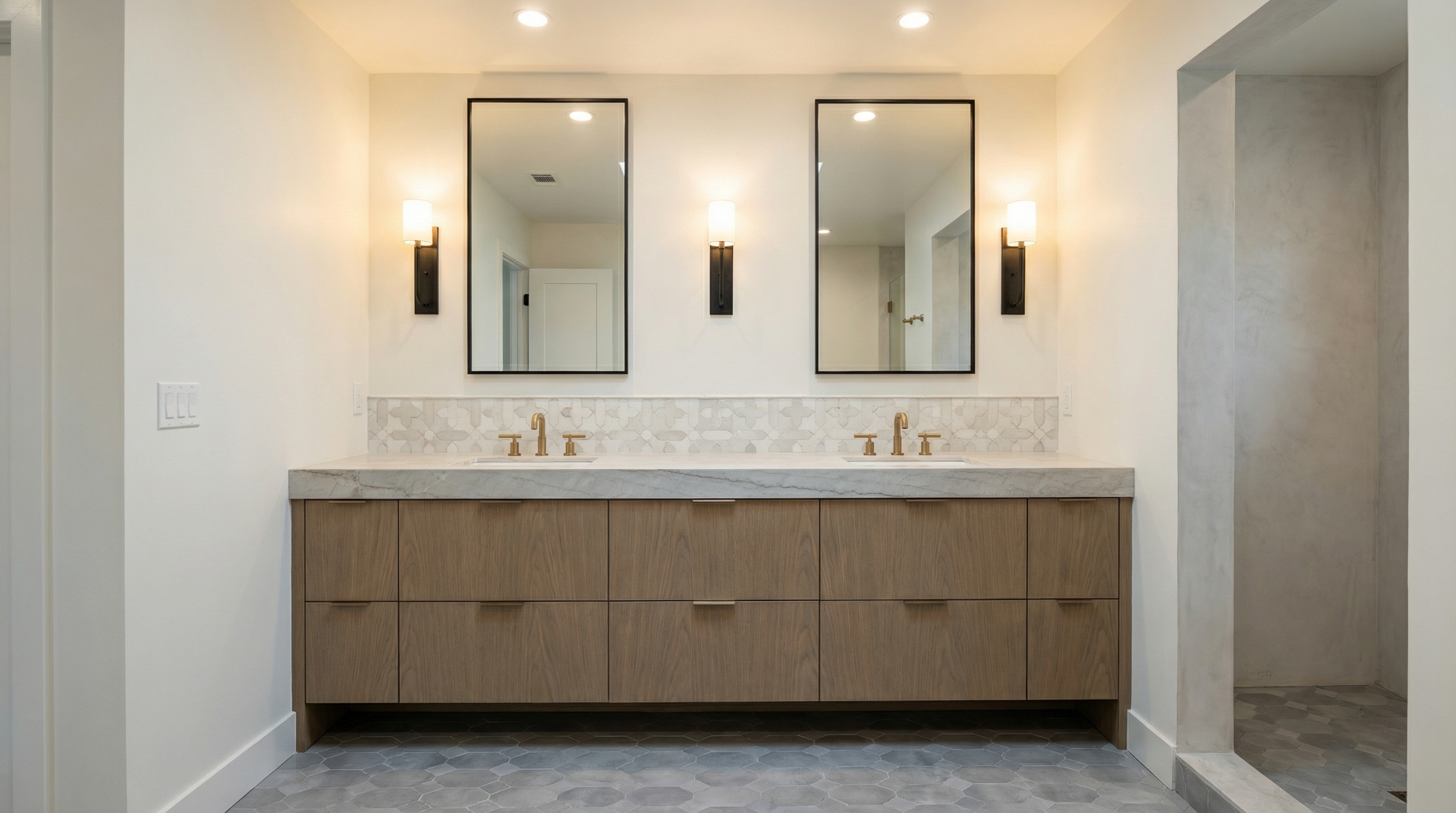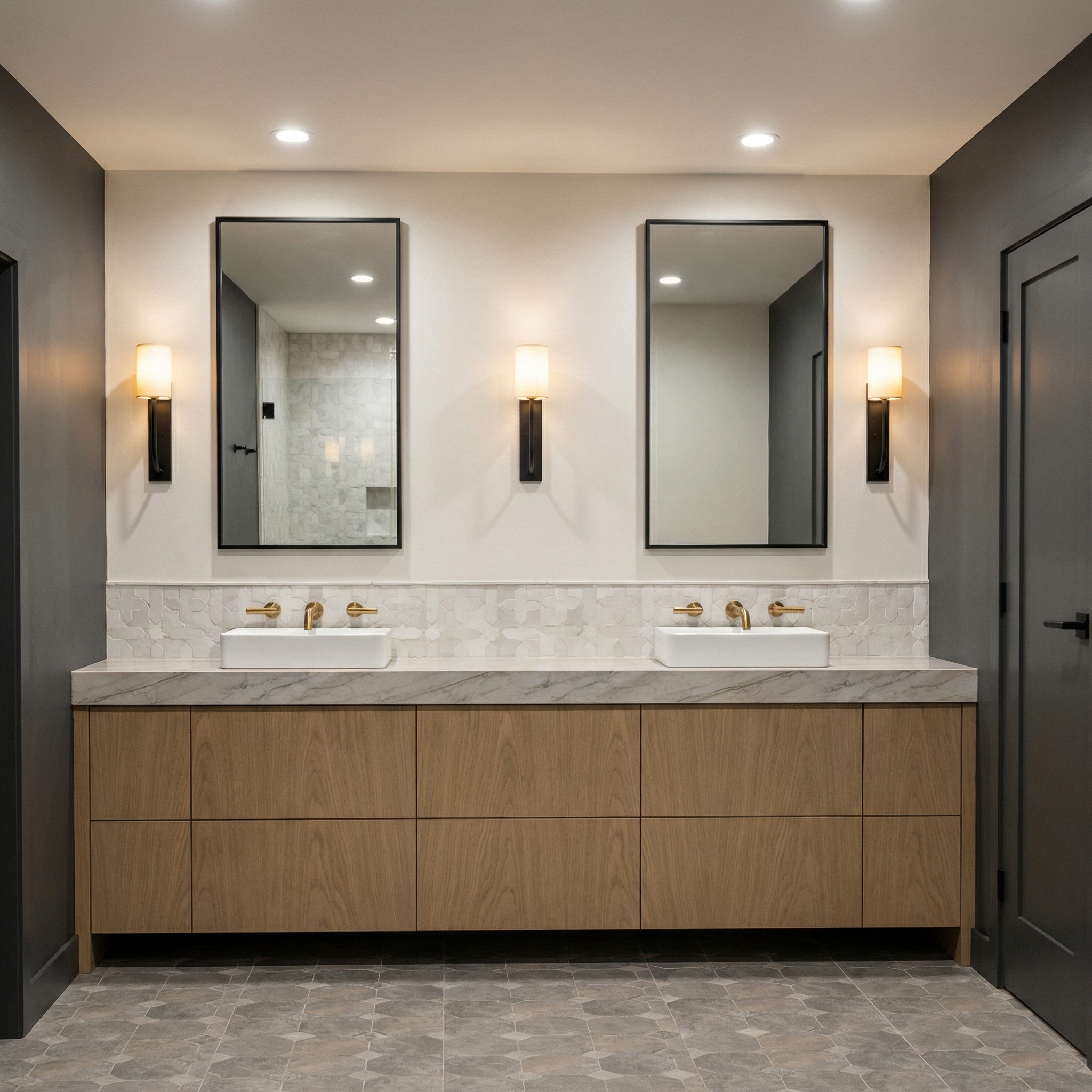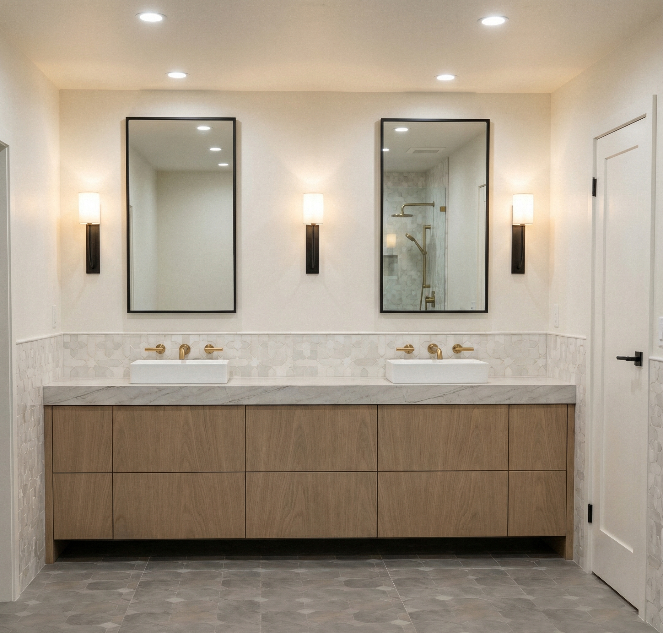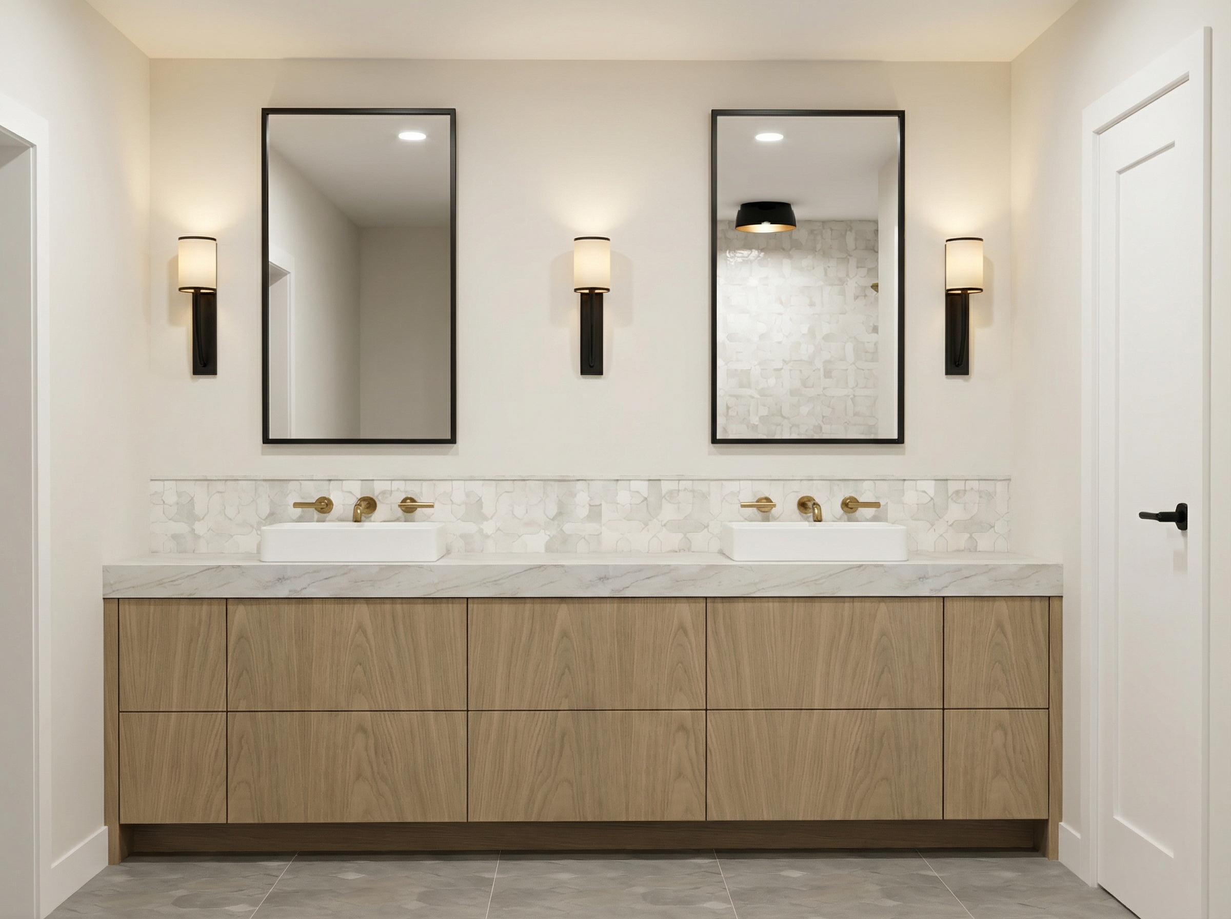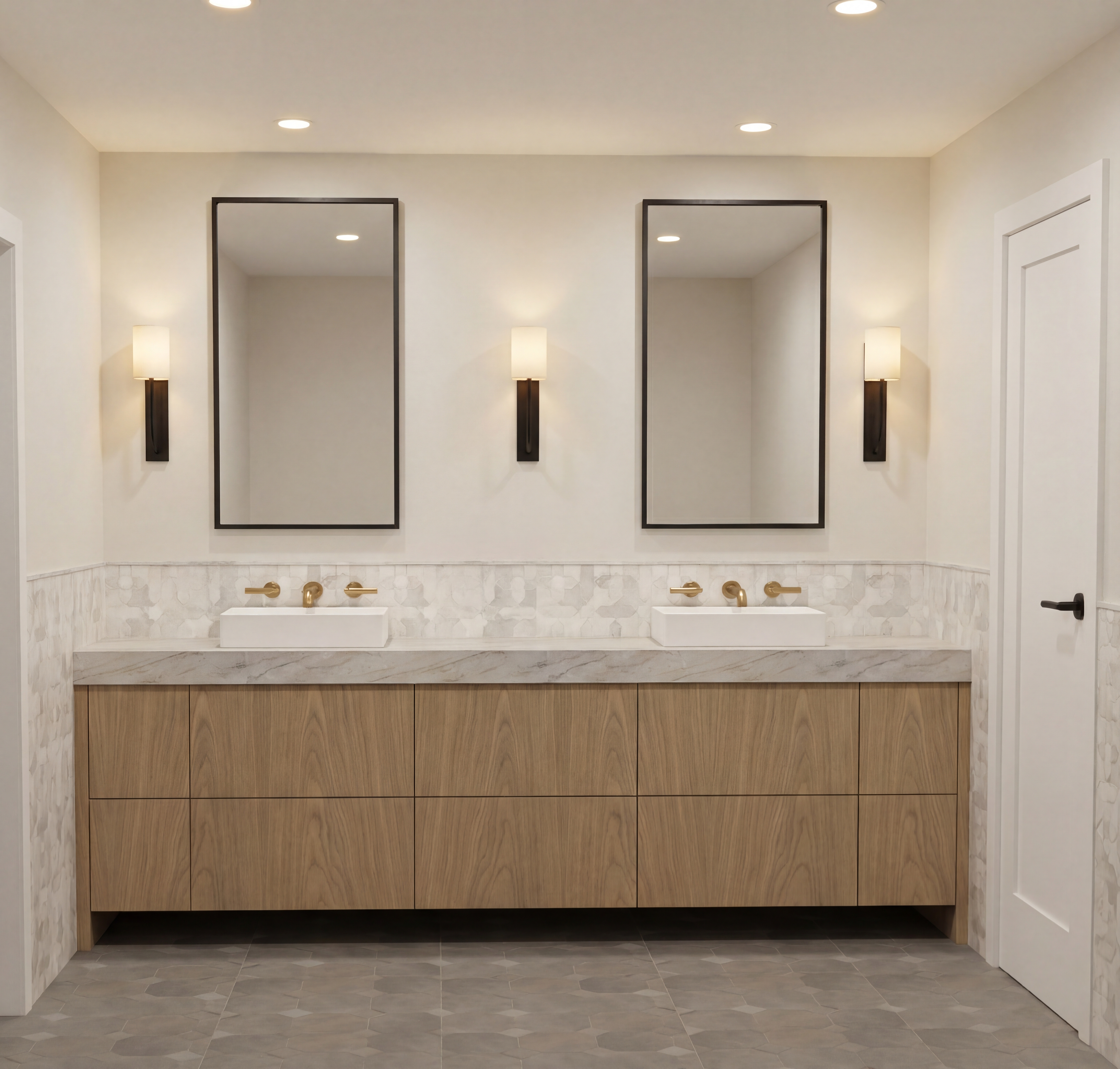 I've uploaded the sketchup render and the materials. The bathroom mirrors and light fixtures are black metal. The overhead light above the bathtub is also black.